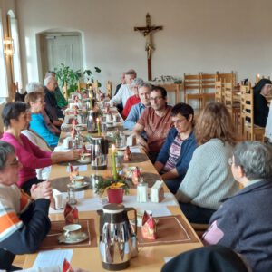 An einer festliche gedeckten Kaffeetafel fanden sich 23 Angestellte, Oblatinnen, wie auch Pfr. Michaele, der nun Pater Theobald vertritt und Frau Pfarrerin Maier wie auch alle Schwestern ein!