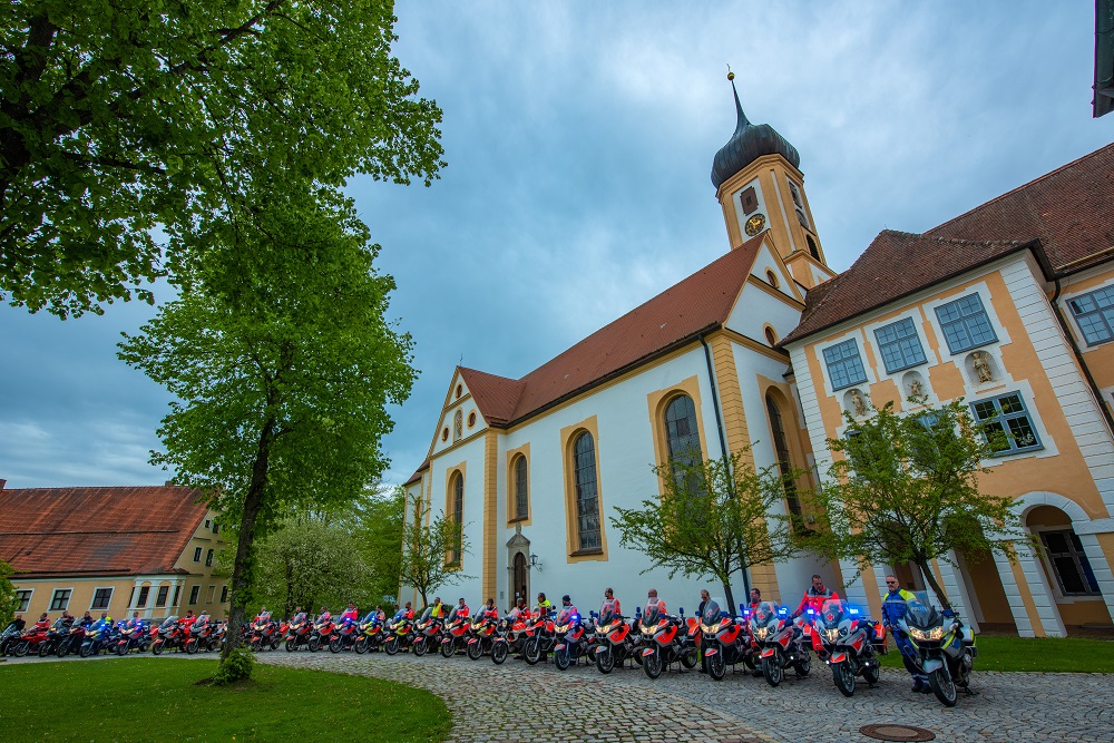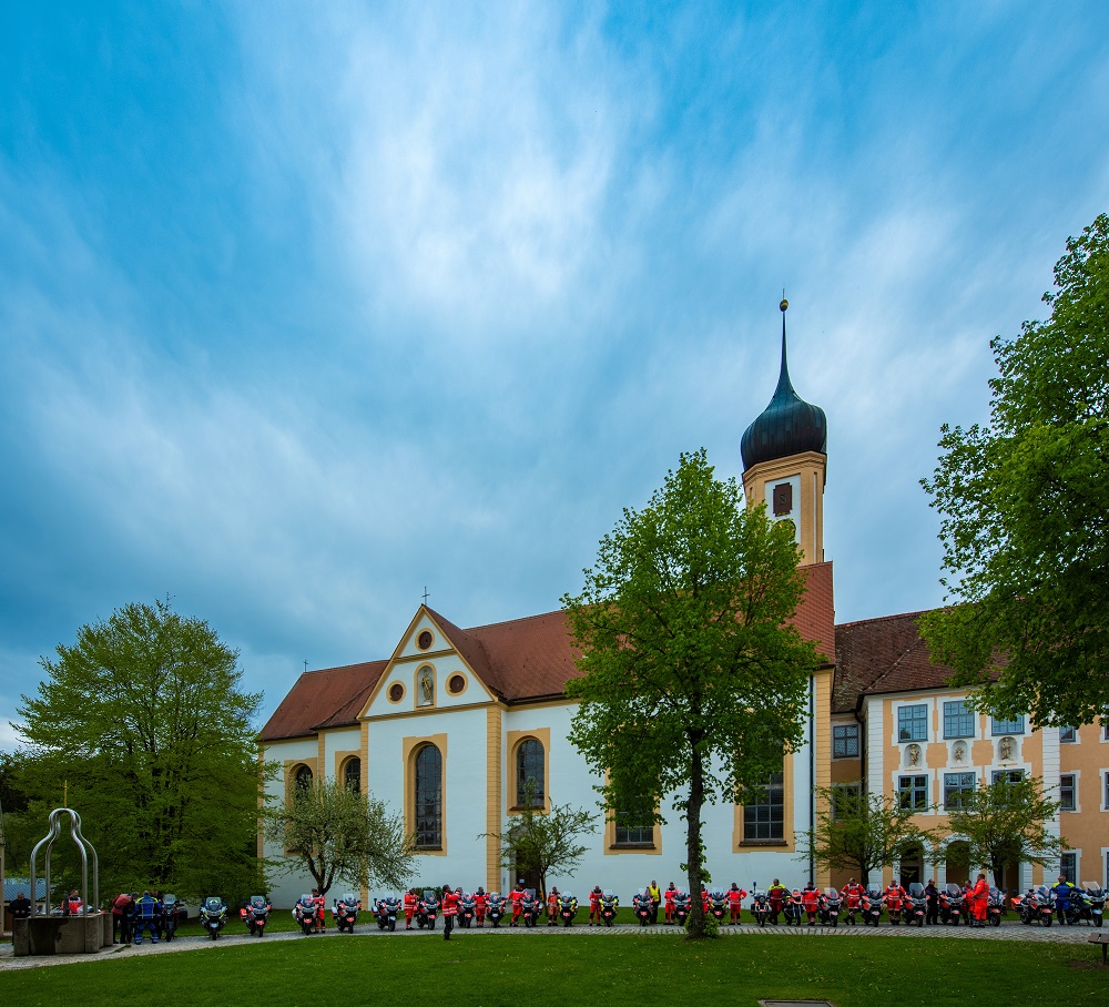 Am 11. Mai feierten die Motorradstreifen des Bayer. Roten Kreuzes ihr 35-jähriges Jubiläum. Es ist seit jeher eine besonders schöne Tradition, dass zu Beginn der Motorradstreifensaison das Rote Kreuz seine bayerischen Motorradsanitäter gemeinsam in den Dienst entsendet. Hierzu findet jährlich eine Auftaktveranstaltung statt, die dieses Jahr der Kreisverband Augsburg ausrichtete. Im Rahmen der Feierlichkeiten besuchten die Motorradstreifen auch das Kloster Oberschönenfeld. Und der Regen hat pünktlich mit der Einfahrt der 30 Maschinen, die aus ganz Bayern gekommen sind, Pause gemacht.