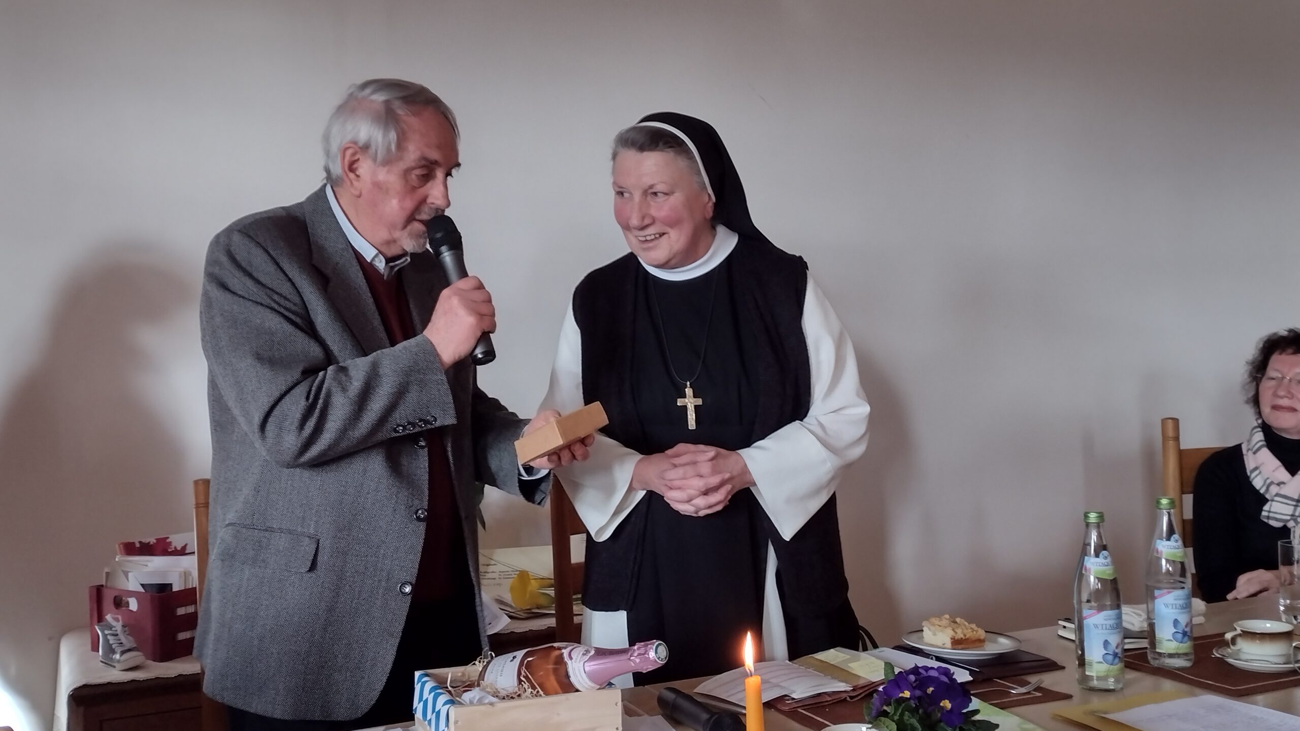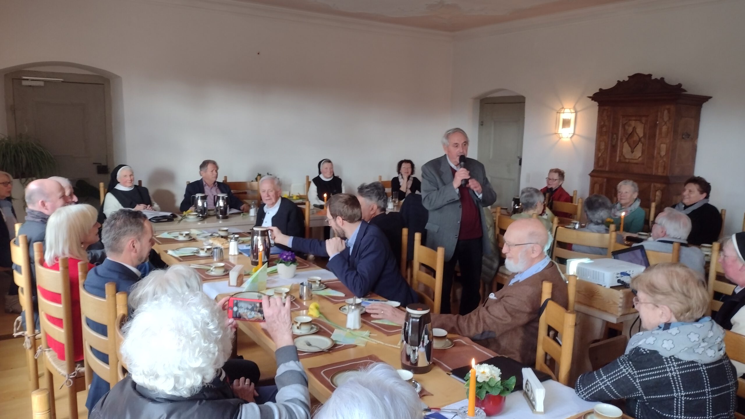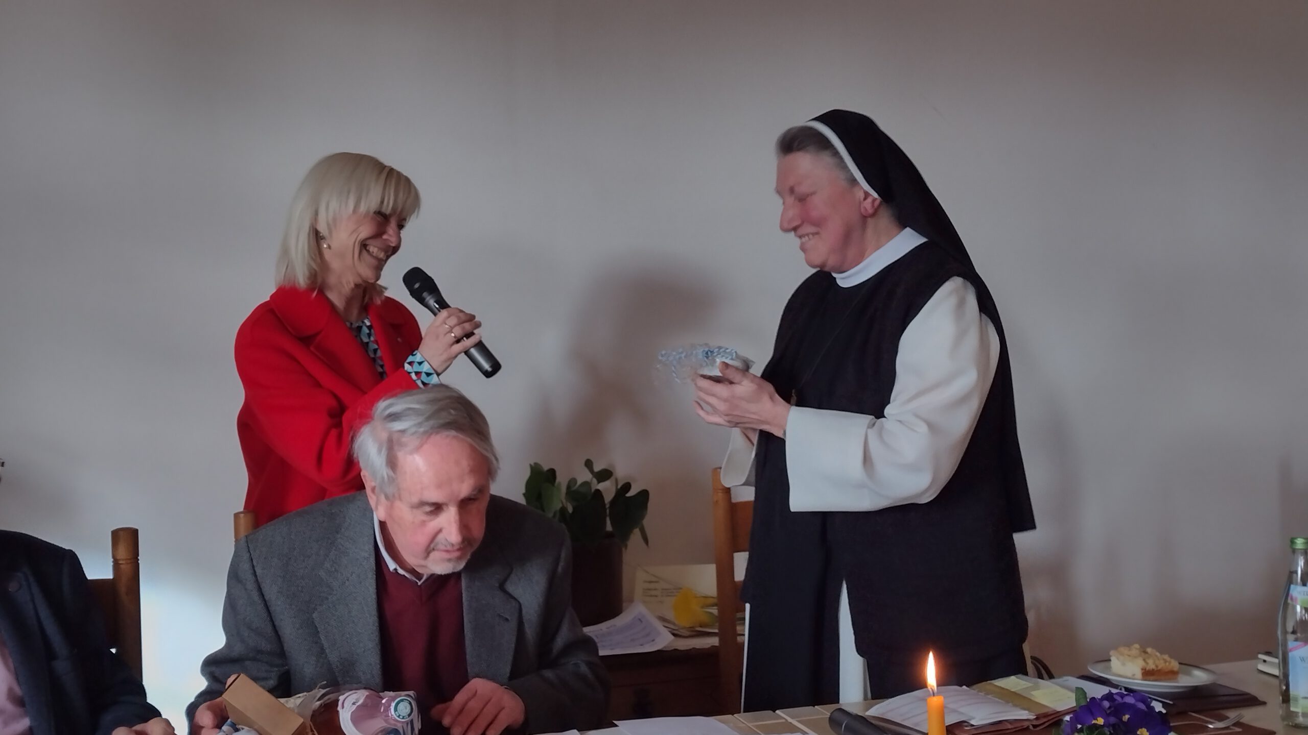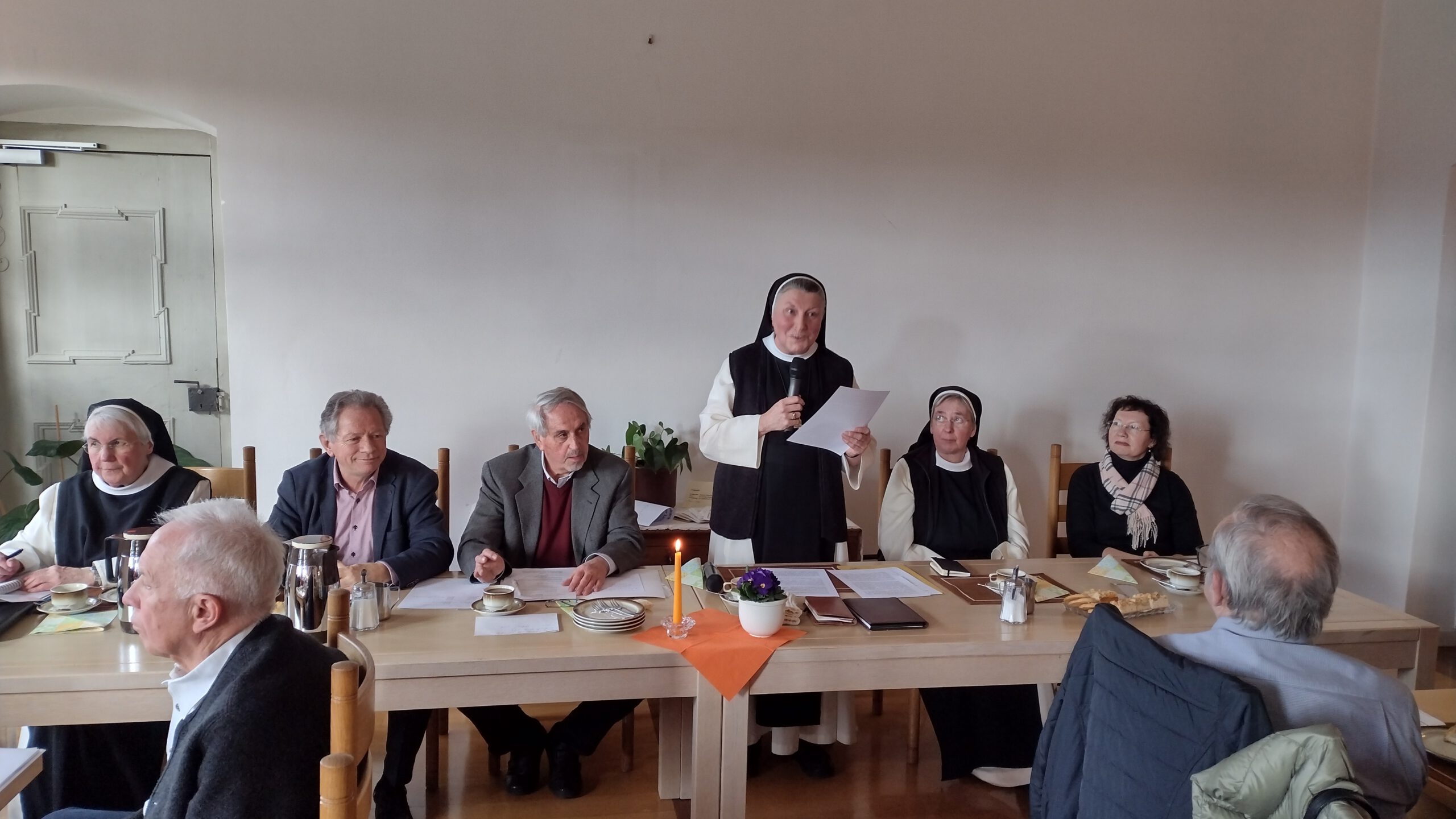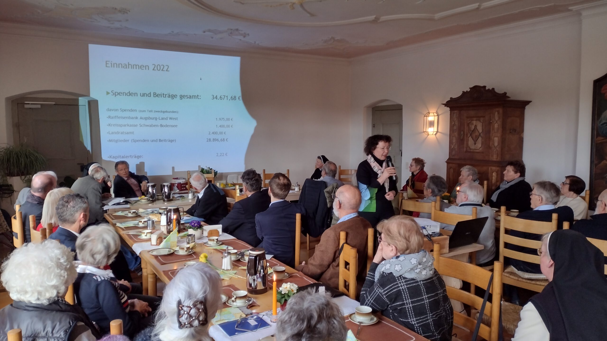 So war es dem Freundeskreis möglich, auch in diesem Jahr dem Kloster eine große Spende zu überreichen. Mit diesem Geld werden wichtige Arbeiten finanziert, wie der ehrenamtliche Finanzberater des Klosters, Wolfgang Warisch, der Versammlung berichtete. Mit dem Geld konnten insbesondere weitere Sanierungen im Sanitärbereich, die Installation einer neuen Brandmeldeanlage sowie die Modernisierung der Trinkwasseranlage mitfinanziert werden. Er stellte auch das geplante Hackschnitzelheizwerk vor, dass künftig die Wärmeversorgung des Klosters auf eine CO2- neutrale Basis stellen soll. Die Äbtissin dankte dem Freundeskreis für die großherzige Spende. Sie würden mit ihrem unermüdlichen Einsatz helfen, als liebenswerte Gärtner die Seele zum Blühen zu bringen.